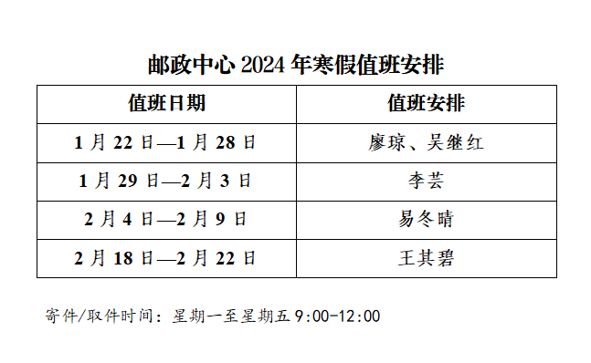 为更好地服务全校师生,保障寒假期间学校相关工作顺利开展,党政办公室每天均安排值班人员,负责学校校章、党委印章、法人印章、学校合同章、党政办公室印章等用印,学校介绍信开具,公文签发审核,会议室申请及使用等工作,请需求单位或师生按规定流程履行签批手续,其他未尽事宜,请与值班老师联系。
