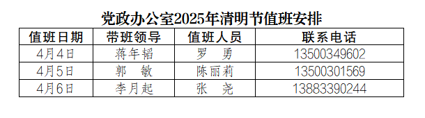 为更好地服务全校师生,保障清明节期间学校相关工作顺利开展,党政办公室每天均安排值班人员,负责学校校章、党委印章、法人印章、学校合同章、党政办公室印章等用印,学校介绍信开具,公文签发审核,会议室申请及使用等工作,请需求单位或师生按规定流程履行签批手续,其他未尽事宜,请与值班老师联系。