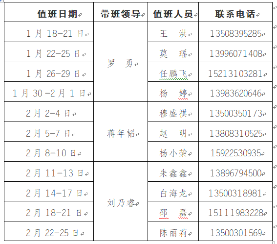 为更好地服务全校师生,保障寒假期间学校相关工作顺利开展,党政办公室每天均安排值班人员,负责学校校章、党委印章、法人印章、学校合同章、党政办公室印章等用印,学校介绍信开具,公文签发审核,会议室申请及使用等工作,请需求单位或师生按规定流程履行签批手续,其他未尽事宜,请与值班老师联系。