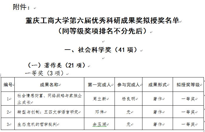 按照《乐动网页版_乐动(中国)科学研究奖实施办法》和《关于组织申报乐动网页版_乐动(中国)第六届优秀科研成果奖的通知》,参照国家科学技术奖、重庆市科学技术奖及重庆市社科优秀成果奖的评价指标体系,本着创新导向,质量优先,宁缺毋滥的原则,科研处组织校外专家成立若干学科评审组对申报成果进行评审。专家按照评分细则对申报成果进行了独立评审和投票表决。综合专家评审意见和授奖建议,形成了乐动网页版_乐动(中国)第六届优秀科研成果拟授奖名单,拟授奖成果共计49项。现将《乐动网页版_乐动(中国)第六届优秀科研成果奖拟授奖名单》予以公示。
