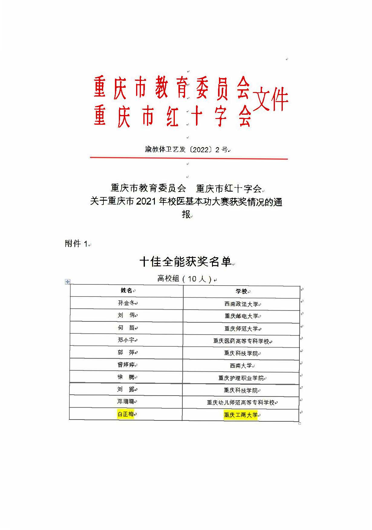 由重庆市教育委员会、重庆市红十字会主办,西南大学、重庆市中小学卫生保健所承办的重庆市校医基本功大赛于2021年12月12-14日在西南大学举行,我校校医院精心组织、积极备战,经过与全市其他高校医院激烈角逐,最终我校校医院勇夺佳绩,取得二等奖3个、三等奖2个,白正梅同志获得十佳校医荣誉称号,学校获得优秀组织奖,校医院负责人获得优秀组织者奖。