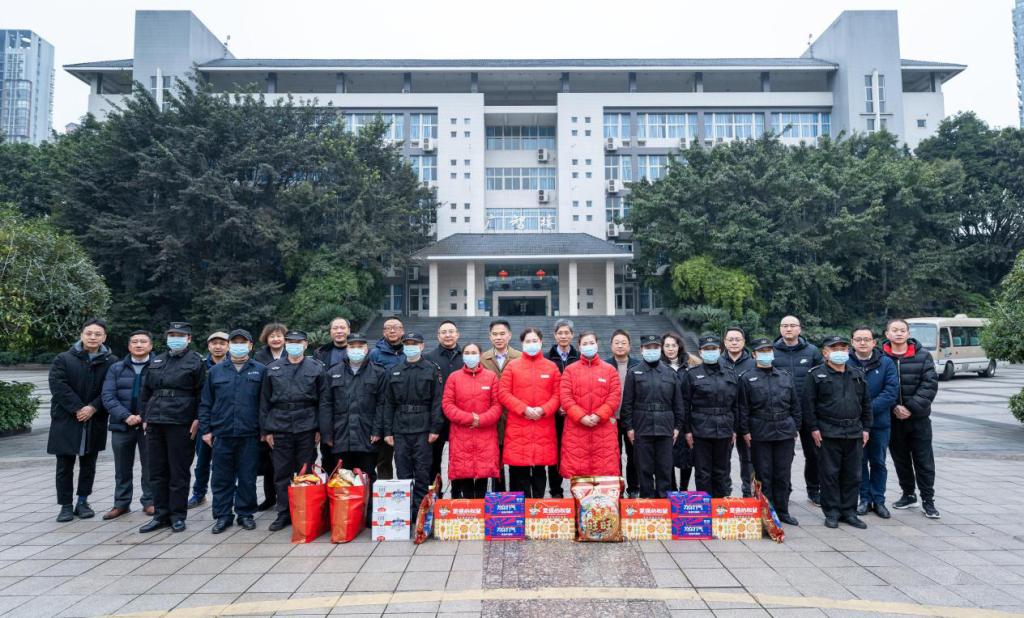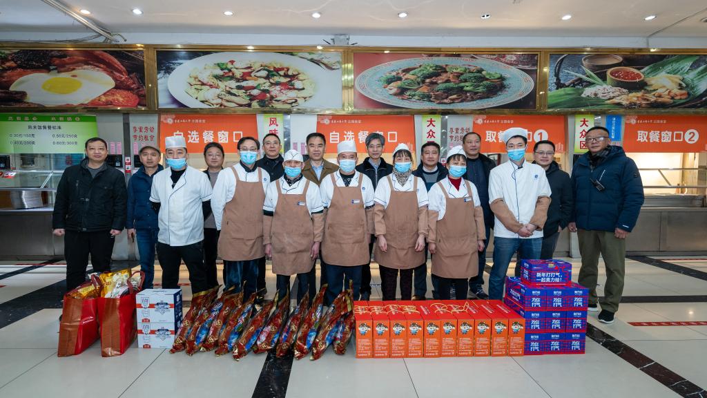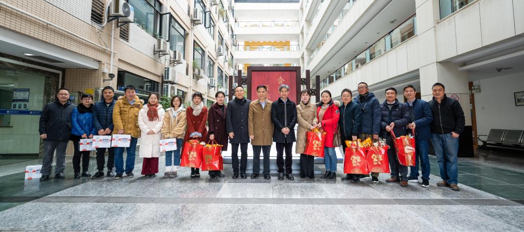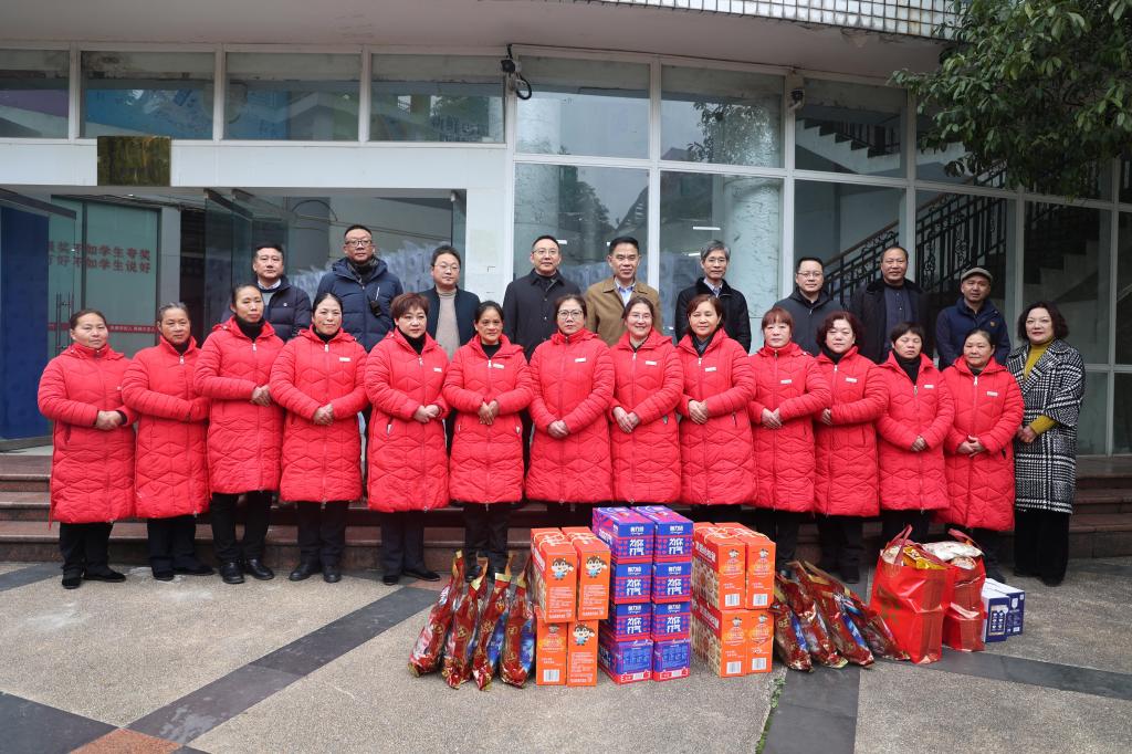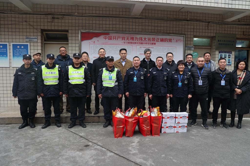 校领导向寒假期间在校全体值班人员赠送慰问品,表达新春问候,并与他们合影留念。