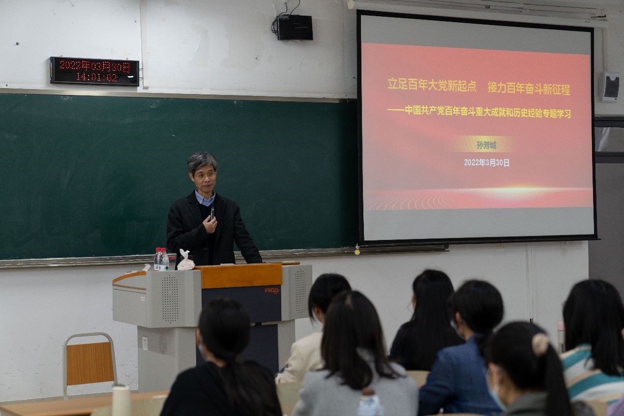 孙芳城以“立足百年大党新起点、接力百年奋斗新征程”为主题,从镌刻史册的伟大飞跃,不可逆转的复兴进程;气象万千的伟大时代,浓墨重彩的崭新篇章;永葆初心的大党担当,伟大光荣的历史贡献;弥足珍贵的精神财富,开创未来的行动指南等四个方面,讲述了中国共产党百年奋斗重大成就和历史经验。