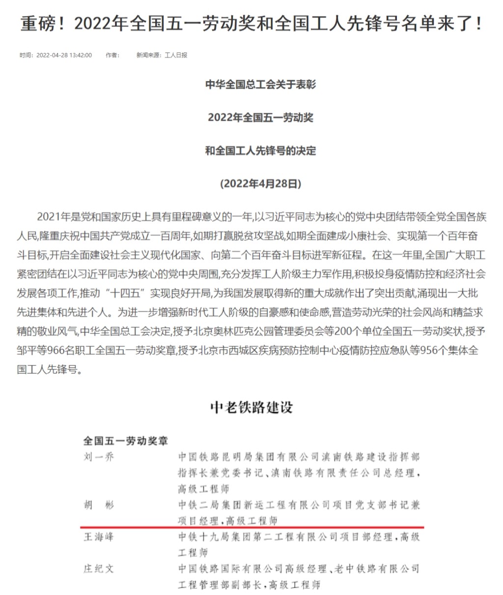 近日,2022年全国五一劳动奖和全国工人先锋号的评审工作已完成。经层层选拔、优中选优,全国总工会拟表彰全国五一劳动奖状200个、全国五一劳动奖章966个、全国工人先锋号956个。我校91级校友,中铁二局集团新运工程有限公司项目部经理、高级工程师胡彬被授予全国五一劳动奖章。