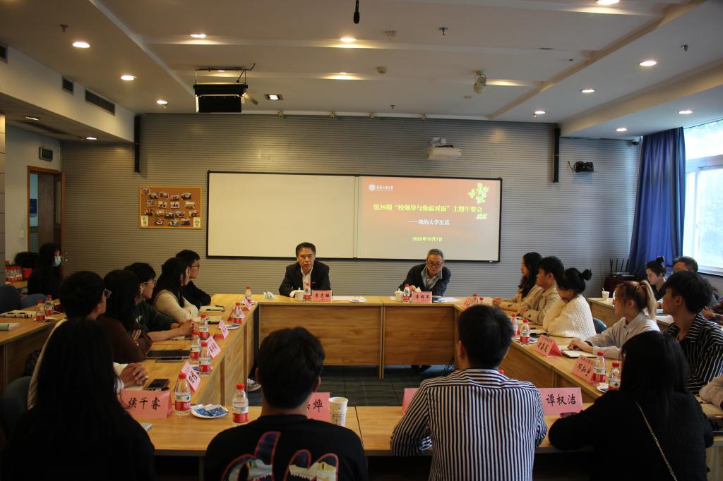 为更好了解同学们新学期在校的学习生活情况,10月7日上午,学校在启智楼80412C举办了主题为“我的大学生活”的第39期“校领导与你面对面”主题午餐会。学校党委书记李志雄、副校长李国军,以及相关职能部门负责同志、南岸校区本科生和研究生代表参会。会议由李国军主持。