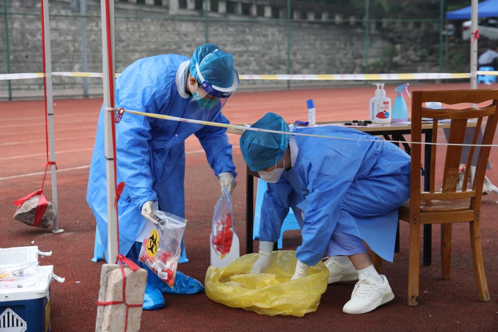 医务人员们奔赴各自的岗位,开始一天的工作。他们被分到不同的区域,有的深入学生公寓,上门为学生做核酸检测;有地赶往家属区,为行动不便的教职工上门采样;有的则在集中核酸检测点,等待着师生员工的到来。上门做核酸检测的医务人员,腰上都要绑一个黄色的塑料袋,便于放置采集的样本。为了不漏一人,他们跑上跑下,一层一层地敲门,腰间的袋子早已经变得沉甸甸了。“再闷再累也要把这一栋楼核酸检测完,才能让大家放心。”