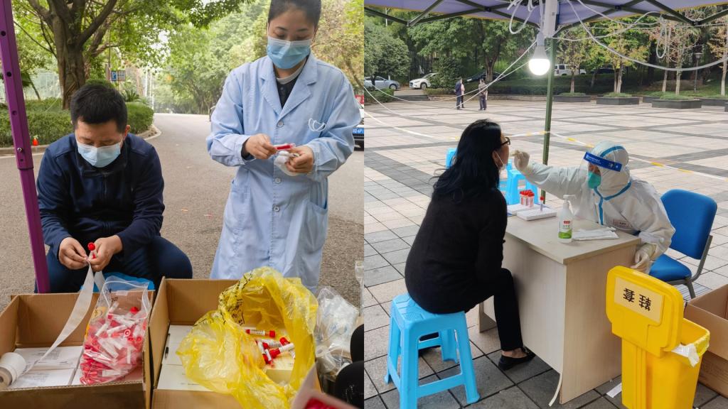 曾晓松在做核酸采样信息录入工作、为学生提供送餐志愿服务