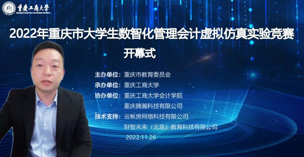 11月26日,由重庆市教育委员会主办,乐动网页版_乐动(中国)承办,重庆腾翰科技有限公司、乐动网页版_乐动(中国)会计学院协办的重庆市大学生数智化管理会计虚拟仿真实验竞赛决赛顺利举办。受疫情影响,本次决赛采取在线方式进行。学校党委常委、副校长赵骅,重庆市教委高教处调研员哈宁武,教务处处长骆东奇,会计学院党委书记邓德敏、院长罗勇,重庆腾翰科技有限公司李银海总经理等参加了开幕式。开幕式由罗勇主持。