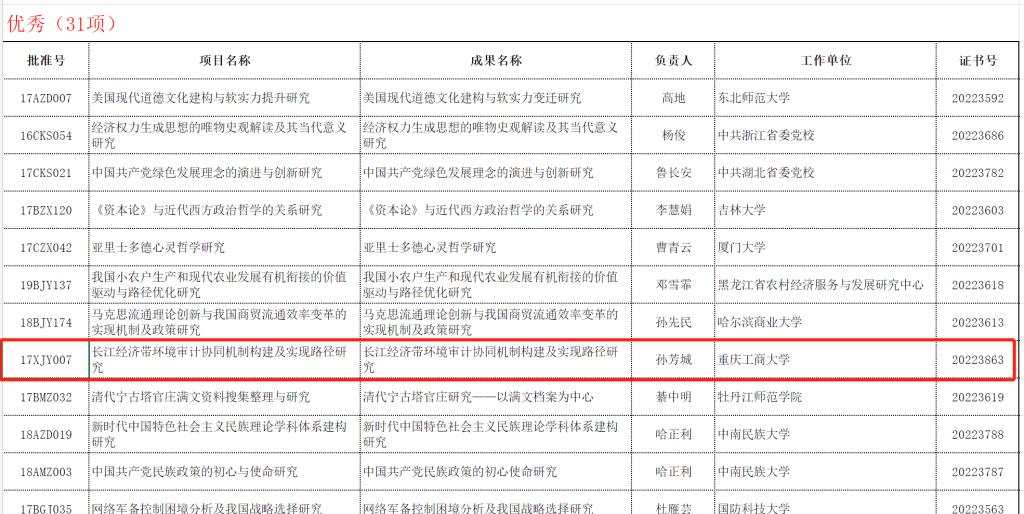 12月1日,全国哲学社会科学工作办公室公布了2022年11月国家社科基金年度项目、青年项目和西部项目结项情况。我校校长、长江上游经济研究中心主任孙芳城教授主持的“长江经济带环境审计协同机制构建及实现路径研究”(项目号:17XJY007,结题证书号:20223863),获得“优秀”等级。