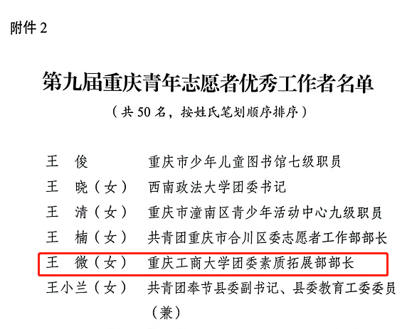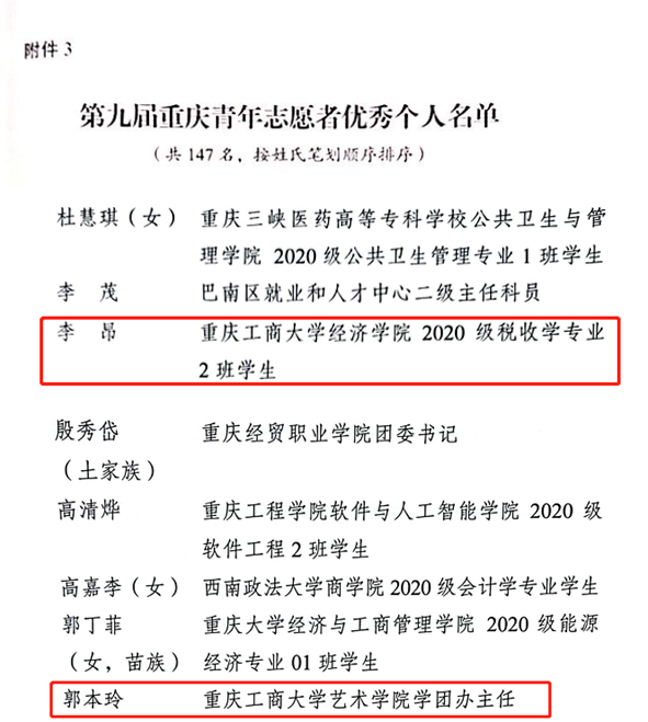 我校法学与社会学学院青年普法志愿服务队获评第九届重庆青年志愿者优秀集体,校团委王微老师获评优秀工作者,艺术学院郭本玲老师、经济学院2020级税收学专业2班学生李昂获评优秀个人。