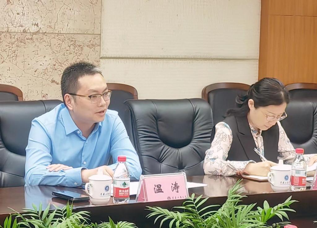 5月8日上午,西部科学城重庆高新区管委会副主任高久鹏一行到我校就深化校地合作工作及进一步推进重庆金融科技研究院建设举行座谈会。座谈会由副校长柏群主持,校长温涛出席会议。高新区财政局、科创局、高新产业发展有限公司相关负责人,学校党政办、科研处、国内合作处相关负责人,金科院院务管理层参与座谈。