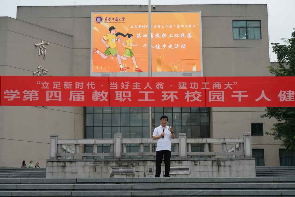 11月10日下午,我校在含弘广场举行“立足新时代·当好主人翁·建功工商大”第四届教职工环校园千人健步走活动。学校党委书记曾维伦,党委副书记宋豫,党委常委、副校长陈运超、张波、李国军、李敬和22个部门工会选派的近1000名教职工参加活动。本次活动由校工会主办。