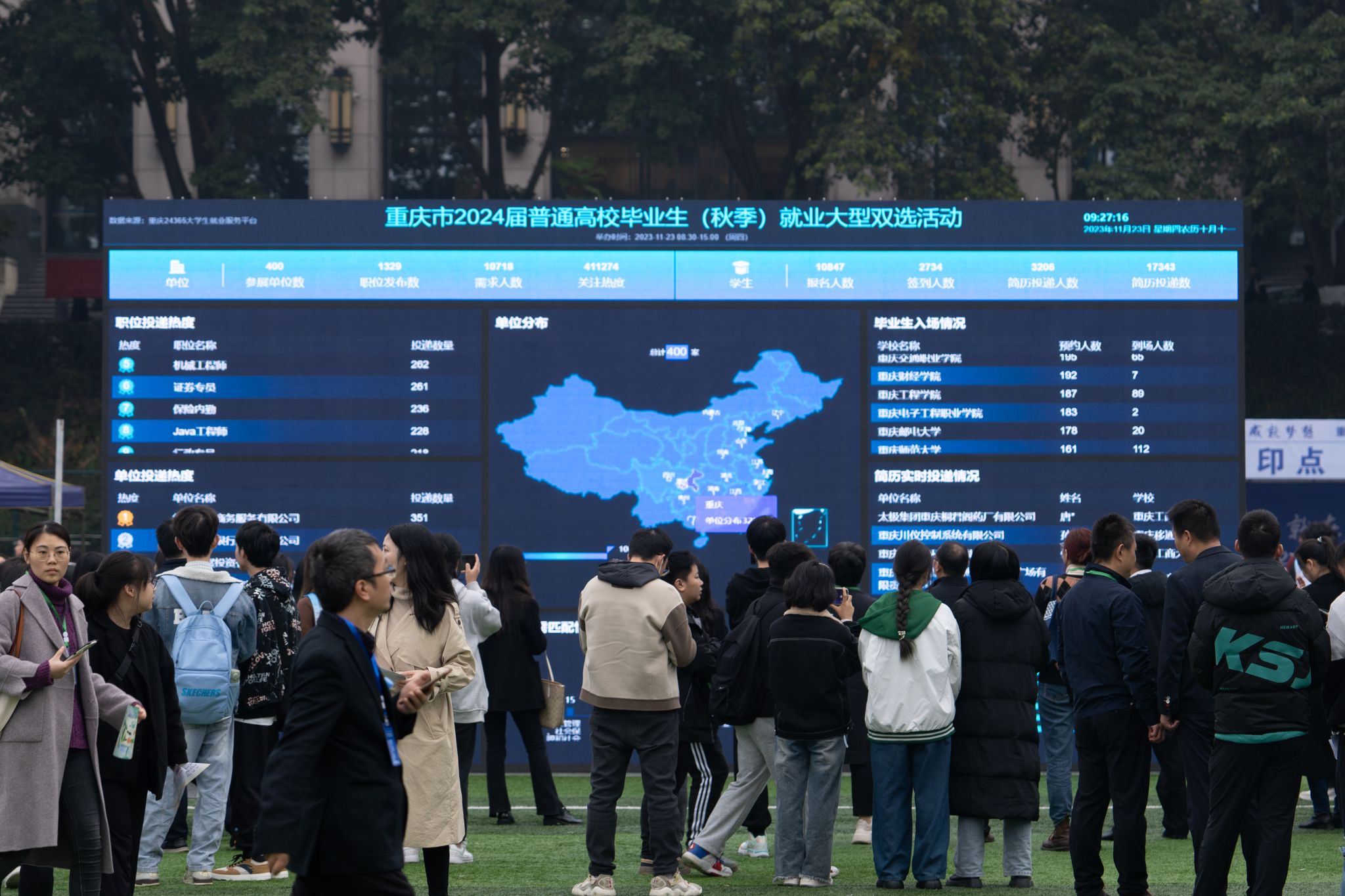 为深入贯彻落实习近平新时代中国特色社会主义思想,全面贯彻党的二十大精神,全面落实党中央、国务院和市委六届二次、三次全会对高校毕业生就业创业工作的决策部署,统筹做好高校毕业生就业工作,全力推动2024届普通高校毕业生高质量充分就业。11月23日,“就在巴渝,成就梦想——重庆市2024届普通高校毕业生(秋季)就业大型双选活动”在我校南岸校区南区运动场举行。