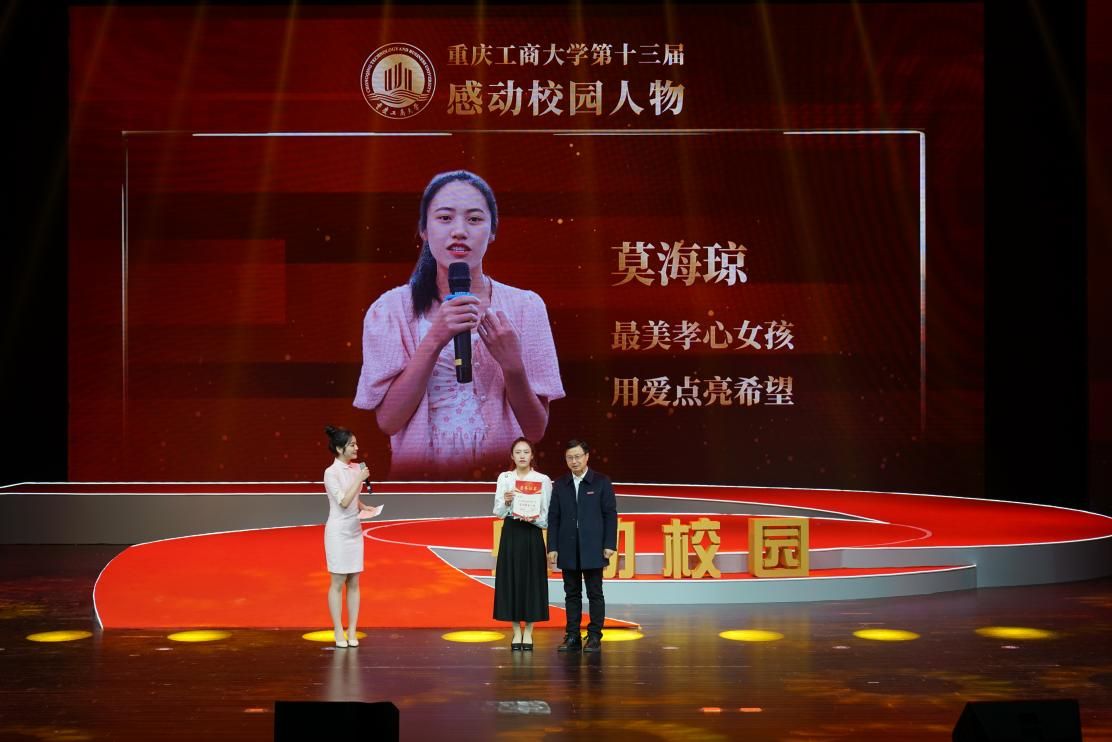 第十三届“感动校园人物”经过线下投票、网络投票、专家打分,共评选出7位个人和3个团队。他们分别是努力拼搏,励志飞翔的环境与资源学院2020级材料科学与工程专业学生蔡清红;架起中泰两国友谊之桥梁,传递“知华友华”精神的留学生院MBA2021级研究生杨过;感恩母校,情牵学子;稳健人生,奉献社会的机械工程学院1994届校友钟仁东;扎根基层、十年如一日为乡村服务,用手中的画笔,助力乡村文化振兴的艺术学院的“艺美乡村”助农志愿服务团;逆境面前扛下责任,义无反顾成为家中顶梁柱的人工智能学院2019级电子信息工程专业学生张建国;大医精诚写大义,白衣执甲显担当的乐动网页版_乐动(中国)校医院;以蹒跚之履觅真理之谛,以渐冻之躯担育人职责的会计学院财务系专任教师程文莉;最美孝心女孩,用爱点燃希望的马克思主义学院2020级思想政治教育专业研究生莫海琼;68载党龄,20多年坚守关工委岗位,积极关心我校下一代发展的原校关工委常务副主任、退休教师吴应发;扎根基层勇担当,一心为民促振兴的乐动网页版_乐动(中国)派驻忠县乡村振兴帮扶干部团队。