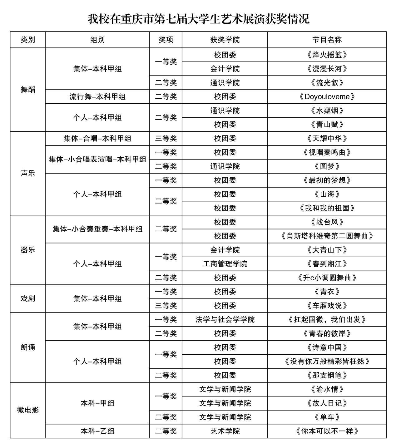 近日,重庆市第七届大学生艺术展演活动落下帷幕,并公布获奖名单。大学生艺术展演活动是重庆市规格最高、规模最大、影响最广的大学生艺术盛会,是高校践行美育育人、落实立德树人根本任务的重要途径。我校共获奖57项,其中一等奖作品16项、二等奖作品29项、三等奖作品12项,在获奖层级、获奖数量上均创历史佳绩。