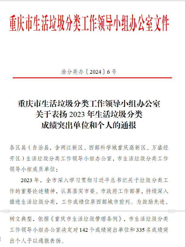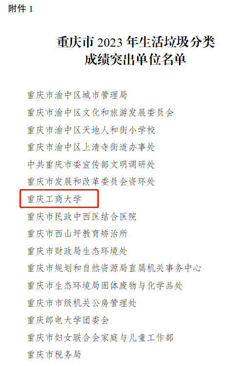 3月1日,重庆市生活垃圾分类工作领导小组办公室印发《重庆市生活垃圾分类工作领导小组办公室关于表扬2023年生活垃圾分类成绩突出单位和个人的通报》(渝分类办〔2024〕6号),我校被评为重庆市2023年生活垃圾分类成绩突出单位。全市共评选142个成绩突出单位,其中高校2所。