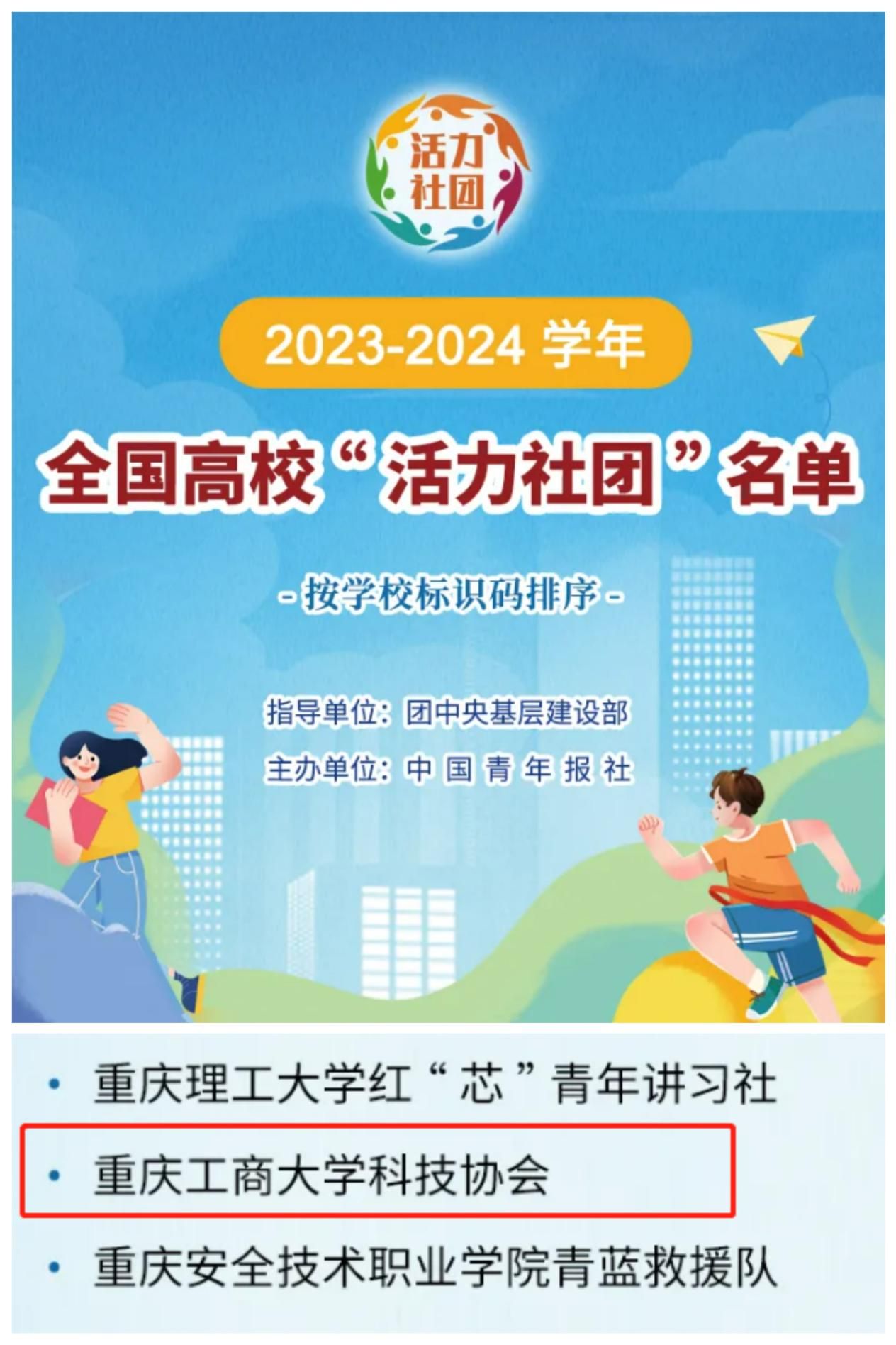 近日,由团中央基层建设部指导、中国青年报社主办的2023-2024学年全国高校“活力社团”评选活动公布获奖名单。我校科技协会从参与评选活动的全国3000余所高校十万余社团中脱颖而出,获评全国高校百强活力社团(重庆市仅3个高校社团获评该奖项)。