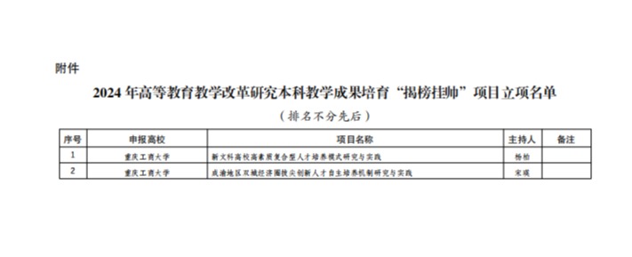 重庆市教育委员会公布《2024年高等教育教学改革研究“本科教学成果培育揭榜挂帅”专项项目评选结果名单》,全市共85个项目立项,我校杨柏教授牵头的《新文科高校高素质复合型人才培养模式研究与实践》和宋瑛教授牵头的《成渝地区双城经济圈拔尖创新人才自主培养机制研究与实践》的2个项目获批立项。