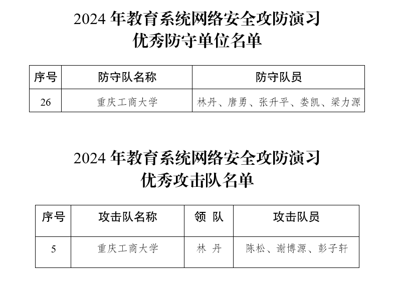 近日,重庆市教委举办了全市2024年教育系统网络安全攻防演习,本次演习有111支防守队伍、15支攻击队参与为期5天的实战演习,共评选出优秀防守单位28支、优秀攻击队11支。我校组建了防守队伍和攻击队伍各1支参与演习,最终获评“优秀防守单位”和“优秀攻击队”。