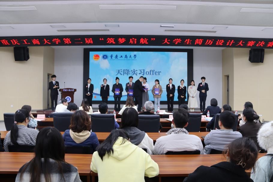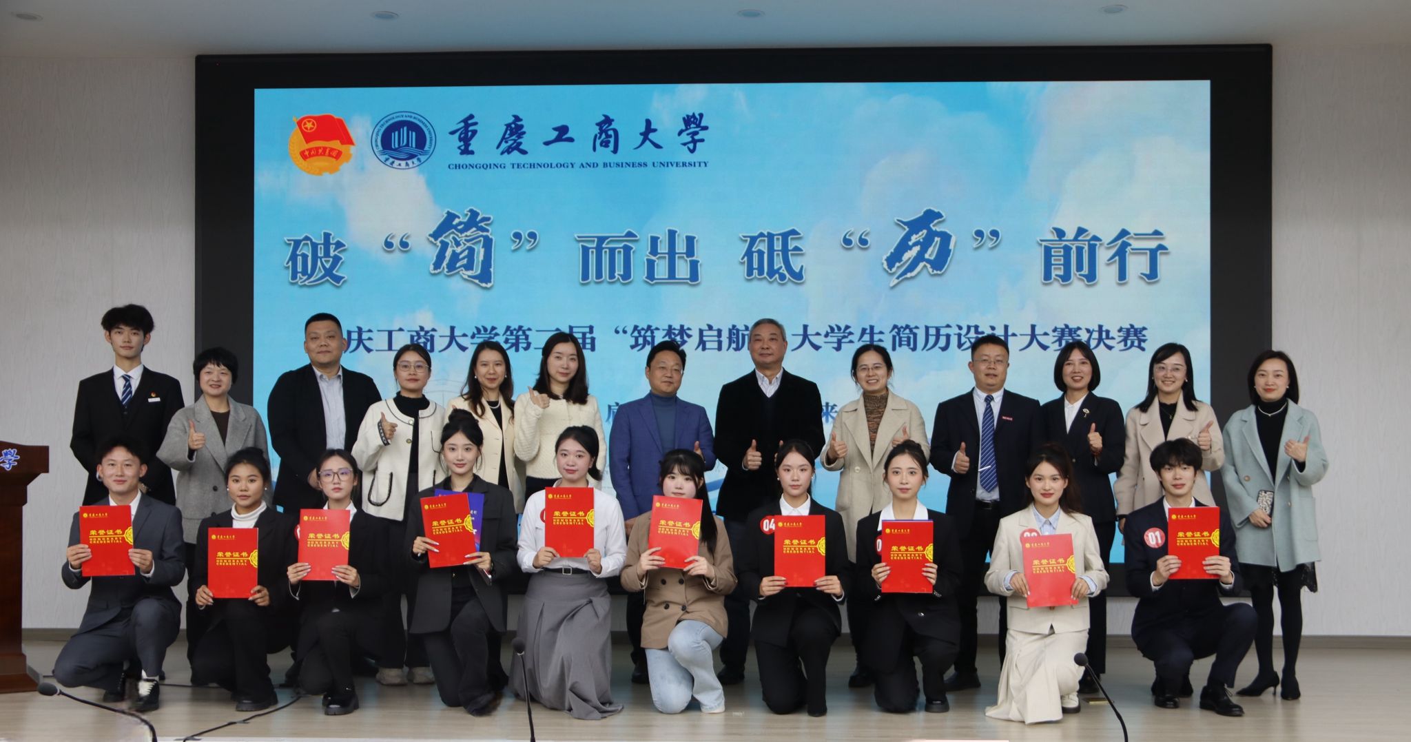 11月22日,由校团委主办、公共管理学院承办的我校第二届“筑梦启航”大学生简历设计大赛决赛于南岸校区明德楼1019报告厅举办。党委常委、副校长李国军,团市委高校工作部副部长刘丽霞,党委学工部部长申卫东,校团委书记吴佑波、副书记王微,公共管理学院党委书记陆嘉、副书记谢书楠与现场200余名同学共同观摩比赛。大赛邀请了中国电信重庆南岸分公司党委委员、副总经理侯思羽,招商银行重庆分行人力资源部副总经理王肖潇,智联招聘重庆分公司总经理杨帆,赛力斯集团股份有限公司校招负责人吴倩,珠海万达商管重庆分公司人事行政高级经理杨利担任评委。