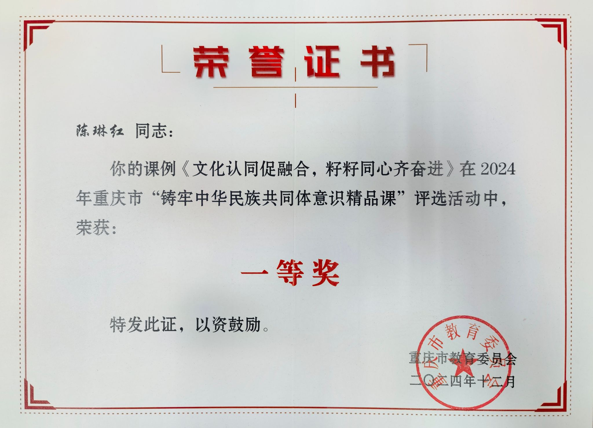 近日,重庆市教委通报了2024年重庆市“铸牢中华民族共同体意识精品课”评选活动结果,我校马克思主义学院陈琳红老师的课例《文化认同促融合,籽籽同心齐奋进》荣获一等奖。