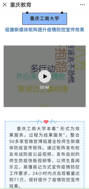 宣传部舆情组及时收集和梳理师生关于疫情防控的舆情,形成舆情专报2期;学校新媒体矩阵联盟先后转发《新型冠状病毒防护须知》以及《@全体重工商大人!面对新型病冠状病毒,我们应该这样做!》等稿件,发起《我是乐动网页版_乐动(中国)青年,面对疫情,我承诺》活动,并通过矩阵发布校友肖战防疫公益视频和学校自创的5个版本的乐动网页版_乐动(中国)师生防疫快板视频等,以师生喜闻乐见,易懂易记的方式宣传疫情防控工作要求,点击观看量近100万,提升了疫情防控知识普及和工作要求宣传效果,被教委防疫简报报道介绍。