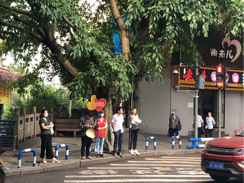 在维护交通秩序组的胡佳同学主要负责劝导行人遵守交通秩序。她顶着烈日,举着告示牌,尽管汗流浃背,但仍感觉快乐。每当成功引领一位行人穿越马路,她都有一种喜悦感与成就感涌上心头。特别是当路人询问她是否是志愿者时,她都会坚定地回答道:“是的,今天是咱们社区的主题党日活动,我不仅是一名志愿者,也是一名入党积极分子,也在争取早日成为一名党员。”