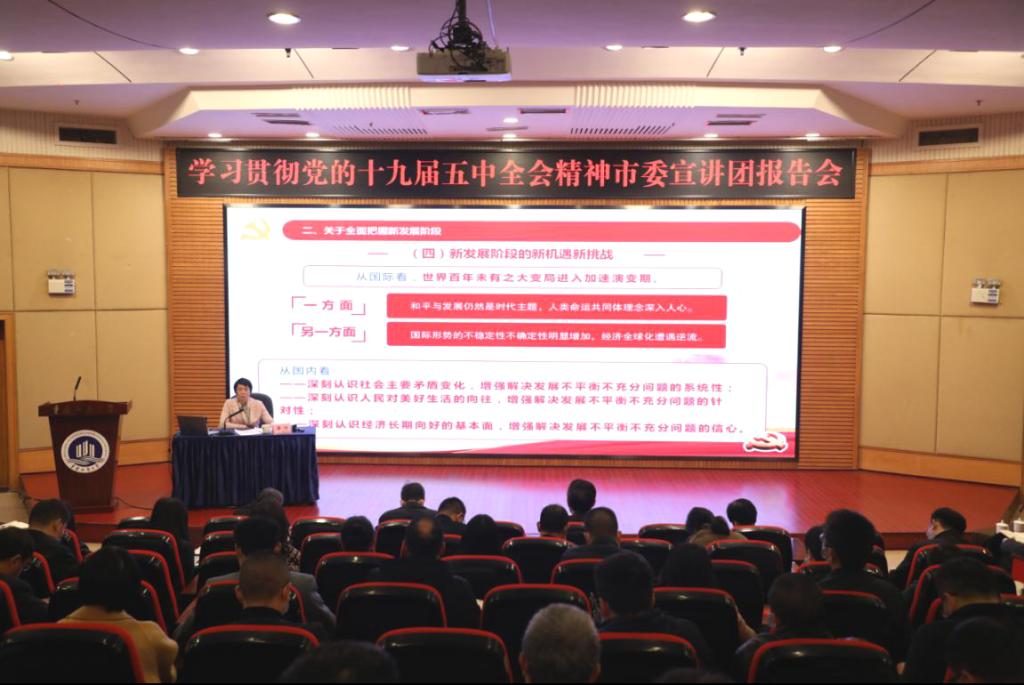 按照市委统一安排,11月23日上午,学习贯彻党的十九届五中全会精神市委宣讲团走进我校。市委宣讲团成员、市委宣传部常务副部长薛竹为我校师生作宣讲报告。报告会由校党委书记李志雄主持。
