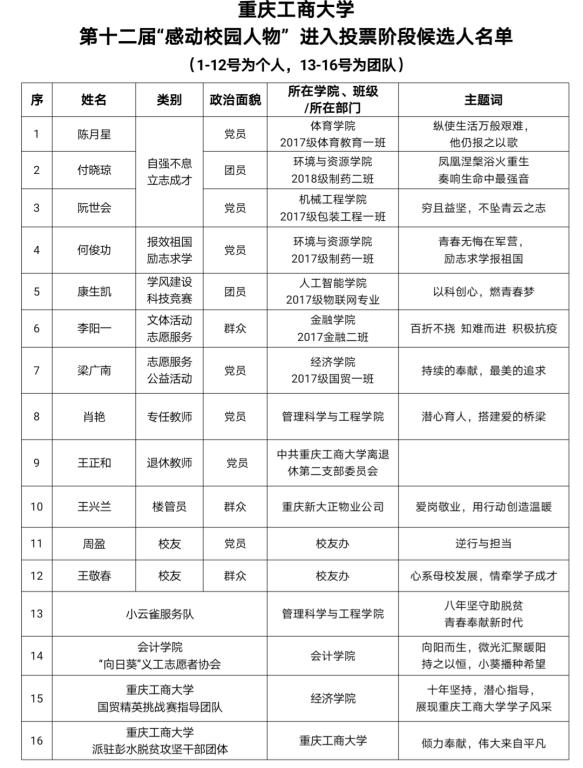 据悉,投票环节将在4月中旬进行,在南岸校区、兰花湖片区、江北校区同步开展现场投票,在“青春工商大”微信公众号开展线上投票。