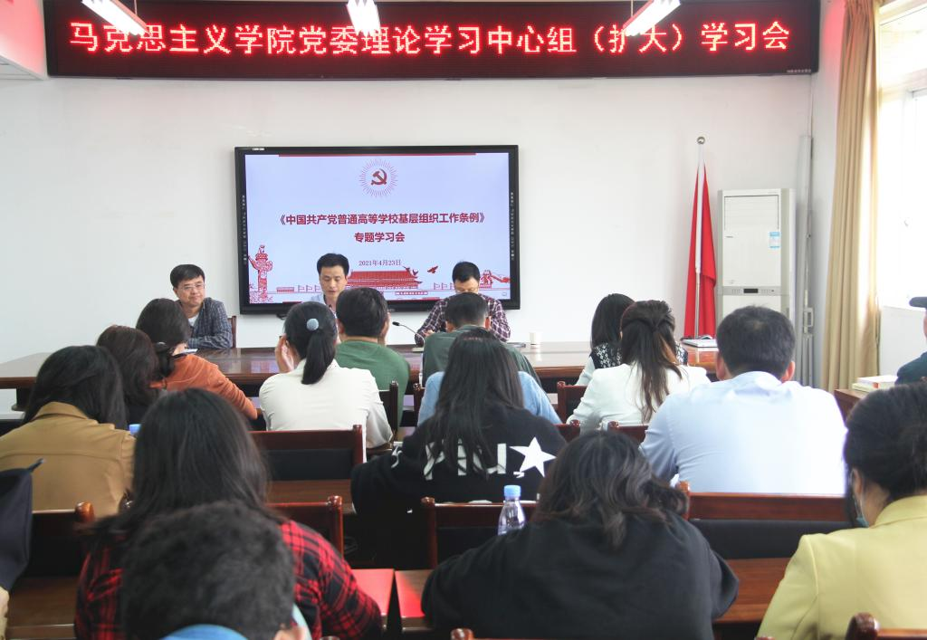 为全力提升新时代基层党组织的工作质量,4月23日下午,马克思主义学院在慧智楼91210会议室召开党委理论学习中心组(扩大)学习会,专题学习《中国共产党普通高等学校基层组织工作条例》(以下简称《条例》)。马克思主义学院在家班子成员和全体党员同志参加会议,会议由党委书记宋明江主持。