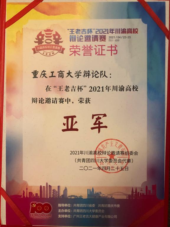 为引导川渝地区青年大学生积极思考、建言献策,主动融入成渝地区双城经济圈建设,彰显新时代大学生的思辨精神,促进川渝地区高校青年大学生的深入交流,加强川渝地区高校在思辨文化育人工作上的深度合作,4月23日至25日,来自川渝地区的8所高校——四川大学、电子科技大学、西南财经大学、西南交通大学、西南政法大学、西南大学、重庆大学、乐动网页版_乐动(中国),汇聚在四川大学江安校区参加2021“王老吉杯”川渝高校辩论邀请赛,我校辩论队喜获邀请赛亚军,校辩论队成员刘薪雨荣获优秀辩手称号。
