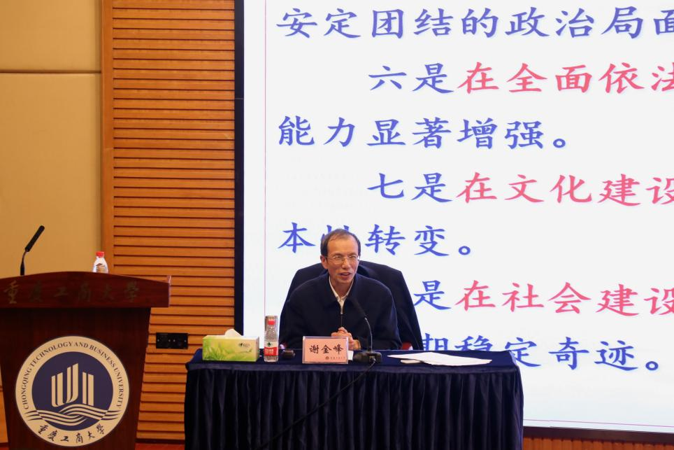 12月9日下午,我校召开党委理论学习中心组(扩大)学习会,深入学习贯彻党的十九届六中全会精神。市委宣讲团成员、市委党校(重庆行政学院)常务副校(院)长谢金峰同志为我校师生作专题辅导报告。校党委书记李志雄主持会议并讲话。