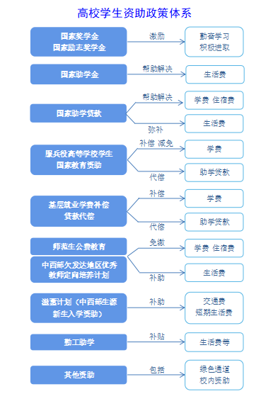 国家在高等教育本专科阶段建立起国家奖学金、国家励志奖学金、国家助学金、国家助学贷款等多种形式有机结合的高校学生资助政策体系。